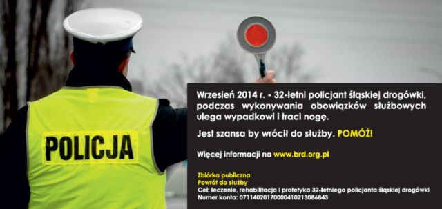 Dzisiaj jeden z nich potrzebuje naszej pomocy. Weźmy udział w aukcji charytatywnej. Dochód zostanie przekazany na zakup protezy i rehabilitację. Zwycięzcy przede wszystkim pomogą potrzebującemu funkcjonariuszowi, ale przy okazji będą mogli przeżyć szczególne chwile podczas: rajdowych emocji w samochodzie Kajetana Kajetanowicza. Za kierownicą usiądzie sam mistrz, który gwarantuje niezapomniane przeżycia; niezwykłego poranku z Adamem Małyszem. Na czym ma on polegać? Szczegóły są pilnie strzeżone przez Pana Adama;