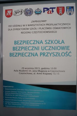 W auli Akademii im. Jana Długosza przy ulicy Armii Krajowej odbyły się II Warsztaty Profilaktyczne dla dyrektorów szkół i placówek oświatowych regionu częstochowskiego pt. „Bezpieczna Szkoła- Bezpieczni uczniowie- Bezpieczna przyszłość”. Organizatorem byli Stowarzyszenie Generałów Policji RP oraz Komenda MiejskaPolicji w Częstochowie, Instytut Edukacji i Bezpieczeństwa Wydziału Matematyczno - Przyrodniczego AJD w Częstochowie, Wydział Zdrowia Urzędu Miasta Częstochowy, a także Szkoła Podstawowa z Oddziałami Integracyjnymi Nr 53 w Częstochowie.