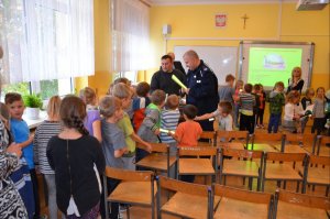 Wczoraj policjanci z Wydziału Ruchu Drogowego Komendy Miejskiej Policji w Częstochowie wraz z przedstawicielem Kasy Rolinczego Ubezpieczenia Społecznego spotkali się z uczniami Szkoły Podstawowej im. 6 Pułku Piechoty w Starym Broniszewie. Uczestnicy akcji promującej bezpieczeństwo, uczyli uczniów zasad bezpiecznego poruszania się po drogach a także omówili znaczenie elementów odblaskowych. Mundurowi podkreślali znaczenie kamizelek odblaskowych i ich wpływ na poprawę bezpieczeństwa pieszych. Na zakończenie spotkania, przedstawiciel KRUS-u wraz z mundurowymi rozdali dzieciom elementy odblaskowe.