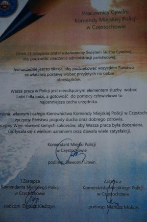 Życzenia Kierownictwa Komendy Miejskiej Policji w Częstochowie dla urzędników i pracowników Policji garnizonu Policji częstochowskiej.