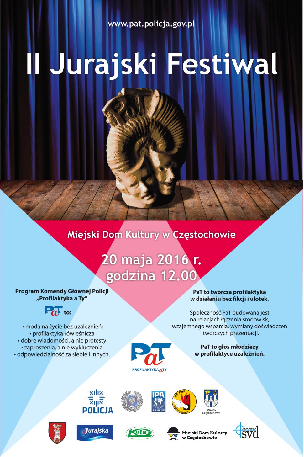 19 i 20 maja 2016 roku w Częstochowie odbędzie się "II Jurajski Festiwal Społeczności PaT" programu realizowanego przez Komendę Główną Policji „Profilaktyka a Ty”. Organizatorami festiwalu jest Komenda Miejska Policji w Częstochowie, Stowarzyszenie Generałów Policji Rzeczypospolitej Polskiej, Prezydent Miasta Częstochowy, Starostwo Powiatowe w Częstochowie, Centralna Szkoła PSP w Częstochowie, Śląska Grupa Wojewódzka IPA oraz Młodzieżowy Dom Kultury w Częstochowie.