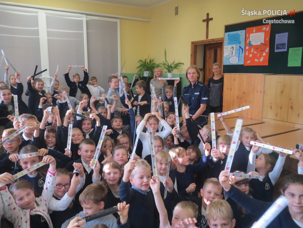 Kolejny raz przypominamy: każdy pieszy, który porusza się po zmierzchu po drodze poza obszarem zabudowanym, musi mieć odblask umieszczony w sposób widoczny dla kierujących. Wielu pieszych stosuje się do przepisów, niestety zdarzają się osoby, które w dalszym ciągu narażają swoje życie... Piesi w dalszym ciągu stanowią bardzo liczną grupę poszkodowanych w wypadkach drogowych. Aby już od najmłodszych lat edukować dzieci w kwestii bezpieczeństwa na drogach, mundurowa odwiedziła dwie częstochowskie szkoły by sprawdzić czy najmłodsi dbają o swoje bezpieczeństwo. W czasie spotkania policjantka uczyła dzieci, jak unikać zagrożeń i bezpiecznie poruszać się po drodze. Poruszyła temat bezpieczeństwa dzieci podczas zabaw na podwórku, przejazdu samochodem i kontaktach z obcymi. Najmłodsi z dużym zaangażowaniem uczestniczyli w prelekcji. Chętnie odpowiadali na pytania i z wielkim zainteresowaniem oglądali elementy wyposażenia funkcjonariuszki. Na koniec spotkania uczniowie otrzymali odblaski aby były widoczne a tym samym bardziej bezpieczne na drogach.