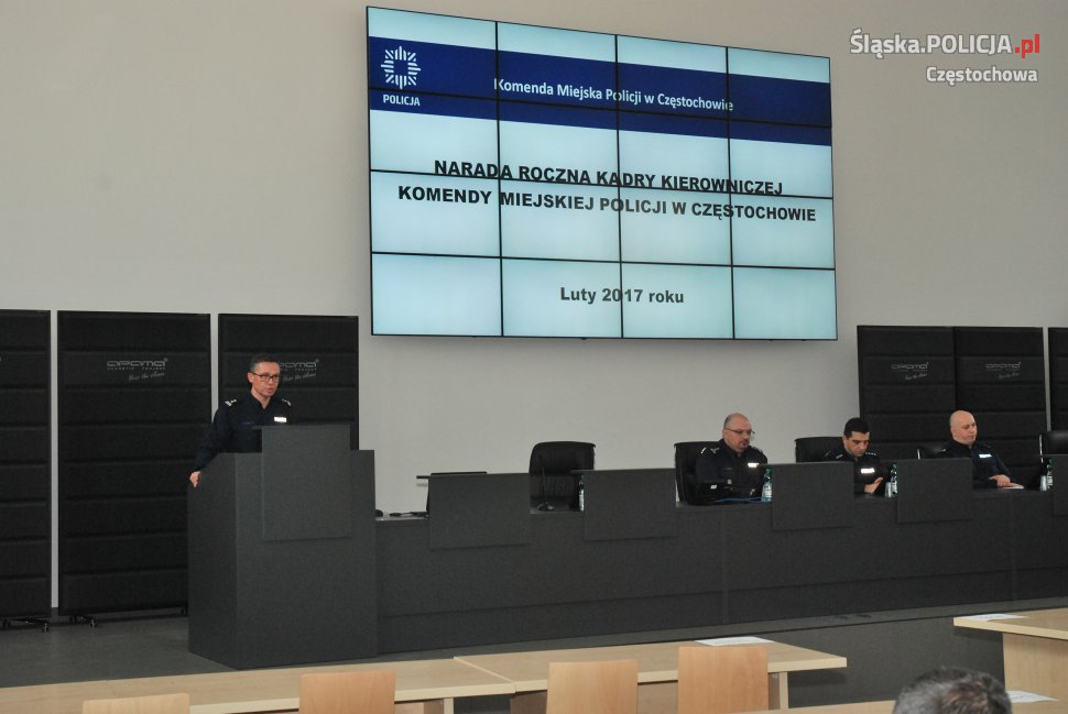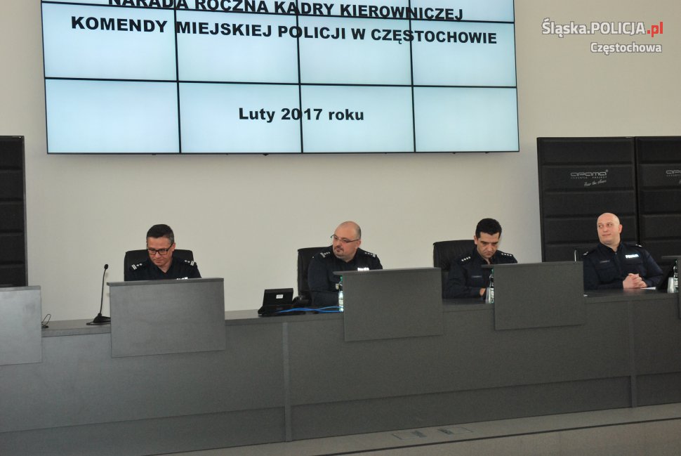 W trakcie spotkania podsumowano pracę mundurowych garnizonu policji częstochowskiej w 2016 roku. Pracę służby prewencyjnej, ruchu drogowego, pionu kryminalnego oraz logistyki przedstawił Komendant Miejski Policji w Częstochowie mł. insp. Sławomir Litwin. Komendant podziękował policjantom i pracownikom cywilnym za całoroczną, owocną pracę, wyrażając przy tym nadzieję na równie dobrą współpracę w tym roku. W naradzie rocznej uczestniczyli zaproszeni goście: w imieniu Prezydenta Miasta Częstochowy Piotr Zasępa, w imieniu Starosty Powiatu Częstochowskiego Krzysztof Smela, wójtowie gmin powiatu częstochowskiego oraz przedstawiciele prokuratury. Spotkanie podsumował Komendant Wojewódzki Policji w Katowicach, inspektor Krzysztof Justyński, który dobrze ocenił służbę częstochowskich policjantów oraz przedstawił priorytety i zadania do realizacji w 2017 roku.