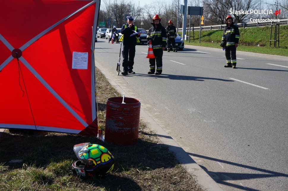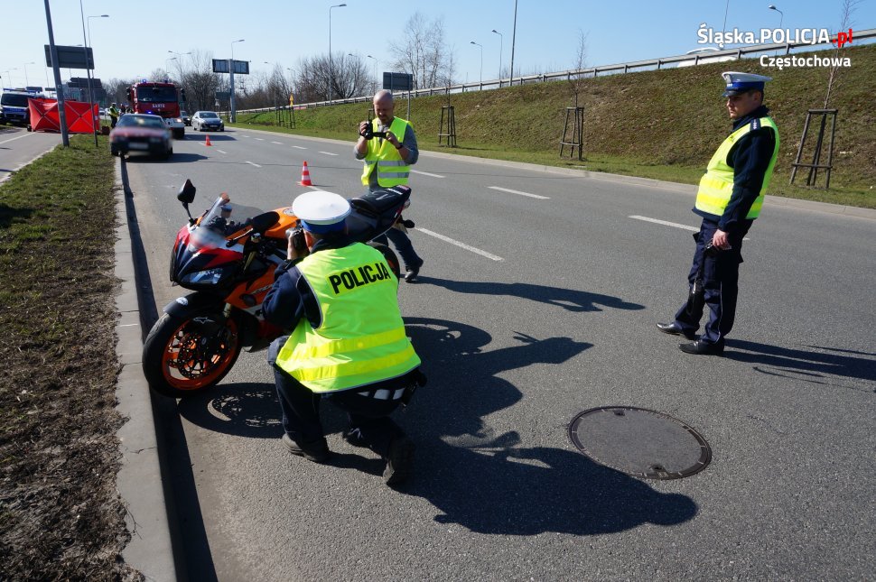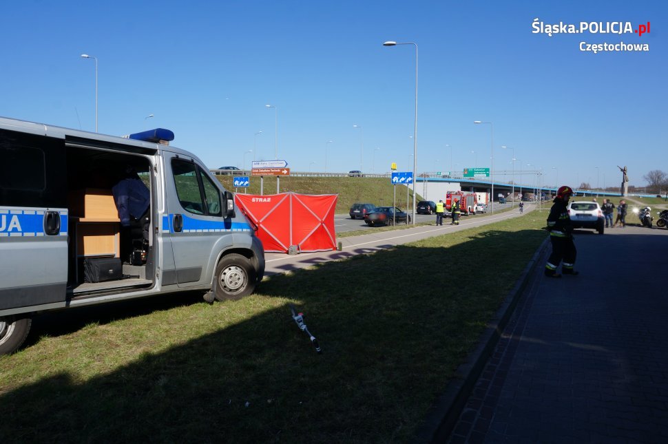 Do zdarzenia doszło dzisiaj (7.04.2018 r.) ok. 13.25 w Częstochowie przy al. Jana Pawła II na pasach ruchu prowadzących do wjazdu na DK1 w stronę Katowic. Ze wstępnych ustaleń policjantów z wydziału ruchu drogowego wynika, że kierujący BMW podjął manewr zmiany pasa ruchu i wtedy zderzył się z nadjeżdżającym z tyłu motocyklistą, który siłą rozpędu uderzył jeszcze w znak drogowy. Jadący motocyklem 43-letni mieszkaniec Częstochowy poniósł śmierć na miejscu. Badanie kierującego BMW wykazało, że był trzeźwy. Na miejscu pracowali policjanci, prokurator, strażacy, ratownicy medyczni i służby drogowe. Śledczy ustalają szczegółowe okoliczności i przyczyny do tego tragicznego zdarzenia.