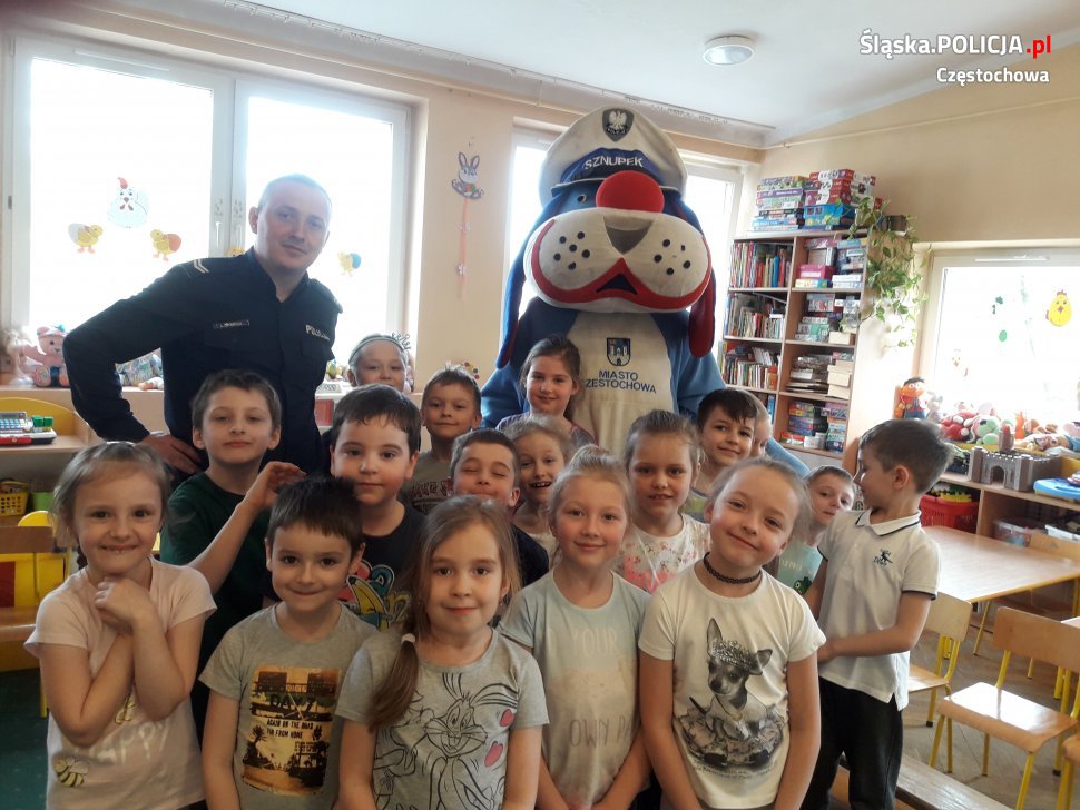 Dzisiaj dzielnicowi z częstochowskiej "dwójki" uczestniczyli w spotkaniu zorganizowanym w Miejskim Przedszkolu nr 6 przy ul. Sosnowej. Mając na uwadze wykorzystanie czytania jako efektywnej formy edukacji bezpieczeństwa częstochowscy policjanci włączyli się do ogólnopolskiej akcji "Cała Polska czyta dzieciom". Podczas spotkania przypomnieli dzieciom zasady bezpiecznego zachowania w domu, szkole, na ulicy. Mundurowi opowiadali o swojej pracy i prezentowali sprzęt wykorzystywany w codziennej służbie. Oczywiście nie zabrakło również Sznupka- maskotki policyjnej, która jak zawsze wprowadziła dzieci w zachwyt.