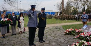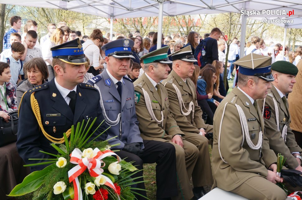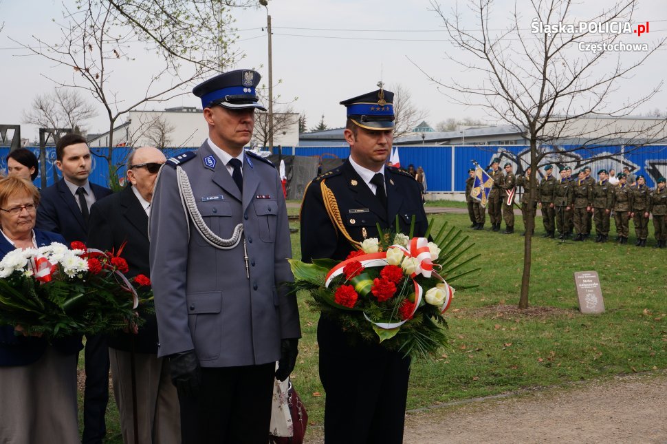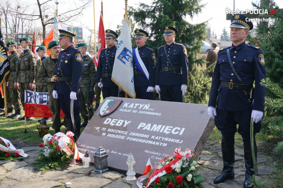 Dla uczczenia pamięci ofiar zbrodni katyńskich zapalone zostały znicze przy pamiątkowych dębach oraz złożone kwiaty przez przedstawicieli służb mundurowych, władz miasta. Komendat Miejski Policji w Częstochowie mł.insp. Dariusz Atłasik wspólnie z przedstawicielem Straży Pożarnej złożyli wiązankę przy tablicy pamiątkowej.