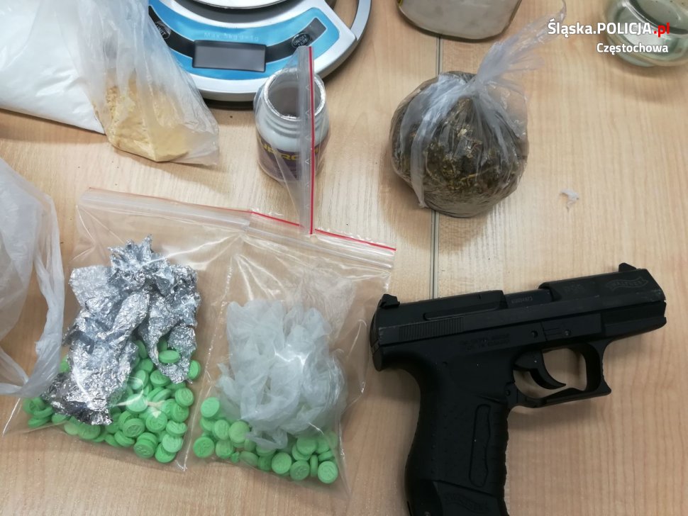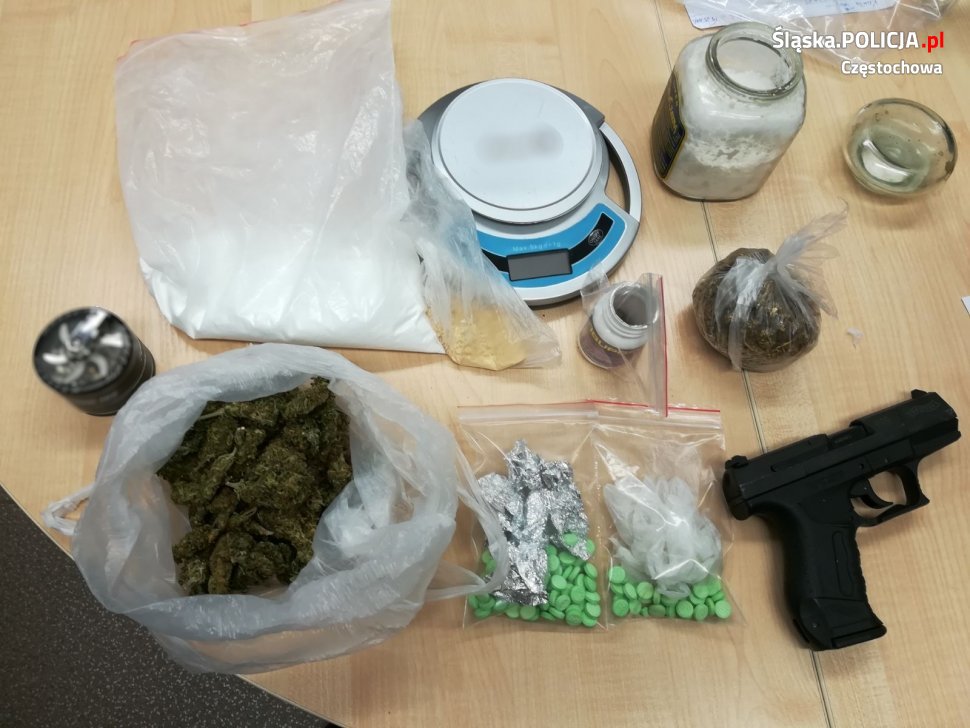Podczas przeszukania zajmowanych przez 25-latka posesji i mieszkania, śledczy znaleźli między innymi: przeszło 100 gramów marihuany, ponad 0,5 kg metamfetaminy, blisko 100 sztuk tabletek ecstasy, prawie 40 gramów amfetaminy, 5 krzaków konopi indyjskich, prawie 20 kg tytoniu i 8,2 tys. sztuk papierosów bez akcyzy. Do tego broń i kilka sztuk nabojów alarmowych. W wyszukiwaniu narkotyków pomagał funkcjonariusz śląskiej Służby Celnej z labradorem Rossi. Zarówno narkotyki, jak i zabezpieczona broń będą teraz szczegółowo badane przez specjalistów.