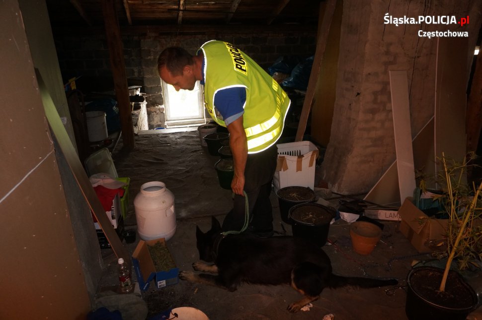 Na miejscu pracowała też Abi – nowa czworonożna „funkcjonariuszka” częstochowskiej policji. Abi jest owczarkiem niemieckim wyszkolonym do wyszukiwania narkotyków. To była jej pierwsza służba w terenie – zakończona sukcesem. Pies od razu po wejściu do domu podjął trop. Okazało się, że na strychu znajdowało się specjalne pomieszczenie, a w nim doniczki z małymi sadzonkami konopi oraz schowany w różnych miejscach susz. Wykonane przez śledczych testy wykazały, że zabezpieczone, wysuszone rośliny, to marihuana. Jej łączna waga wyniosła blisko 10 kg. Policjanci zabezpieczyli też 183 krzaki konopi indyjskich.