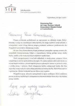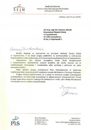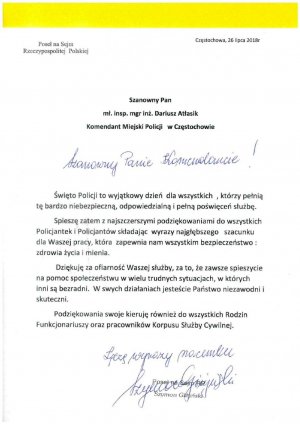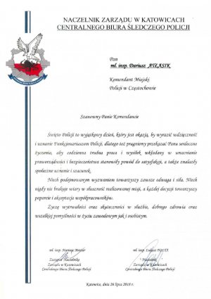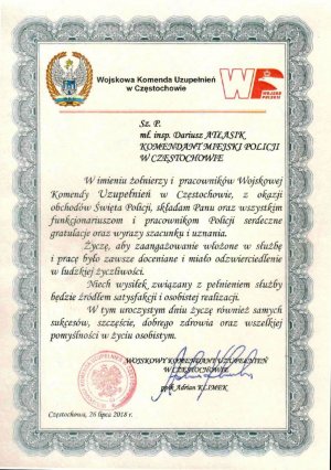 26 lipca 2018 roku o 9.00 na Placu Biegańskiego w Częstochowie odbył się uroczysty apel z okazji Święta Policji. Wśród zaproszonych gości był Zastępca Komendanta Wojewódzkiego Policji w Katowicach insp. Piotr Kucia, pani poseł Halina Rozpondek, przedstawiciele biur poselskich, senatorskich, starostwa powiatowego, miasta i gmin, Straży Pożarnej, Służby Więziennej, Straży Miejskiej, sąsiednich jednostek Policji, a także instytucji współpracujących z Policją, policyjnych związków zawodowych i duchowieństwa.