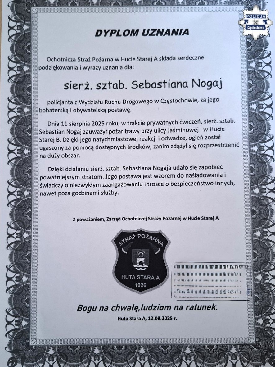 Zarząd Ochotniczej Straży Pożarnej w Hucie Starej B przekazał dyplom uznania dla częstochowskiego policjanta sierż. szt. Sebastiana Nogaja za jego „bohaterską i obywatelską postawę”.Mundurowy w czasie wieczornego spaceru przy ulicy Jaśminowej w Hucie Starej B, w oddali zauważył płomienie ognia, które z każdą chwilą stawały się coraz większe.