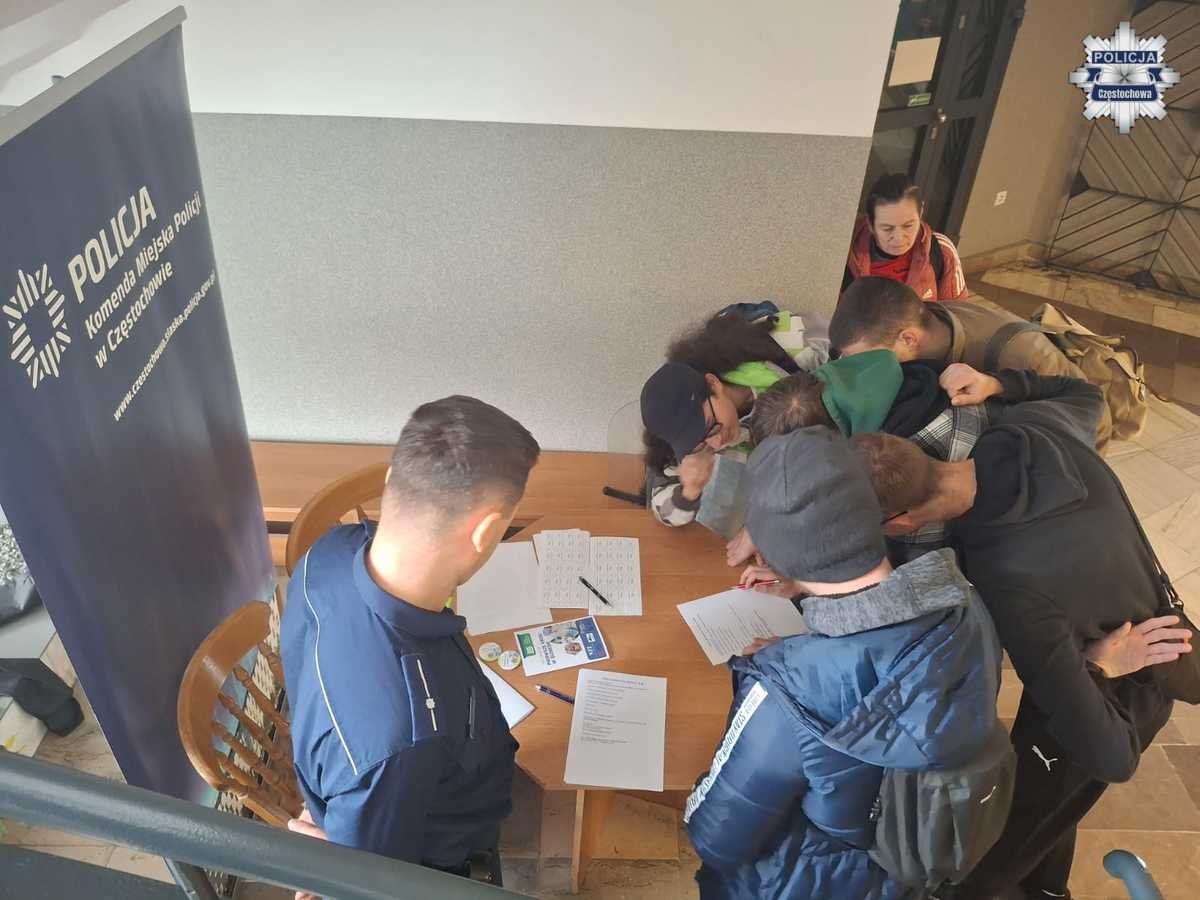 Podczas wydarzenia policjanci Wydziału Prewencji Komendy Miejskiej Policji w Częstochowie – asp. Kamil Sowiński oraz mł. asp. Bartosz Mermer – przygotowali specjalne stanowisko edukacyjne, przy którym młodzież rozwiązywała zadania dotyczące ryzyka handlu ludźmi przy podejmowaniu pracy w Polsce lub za granicą.