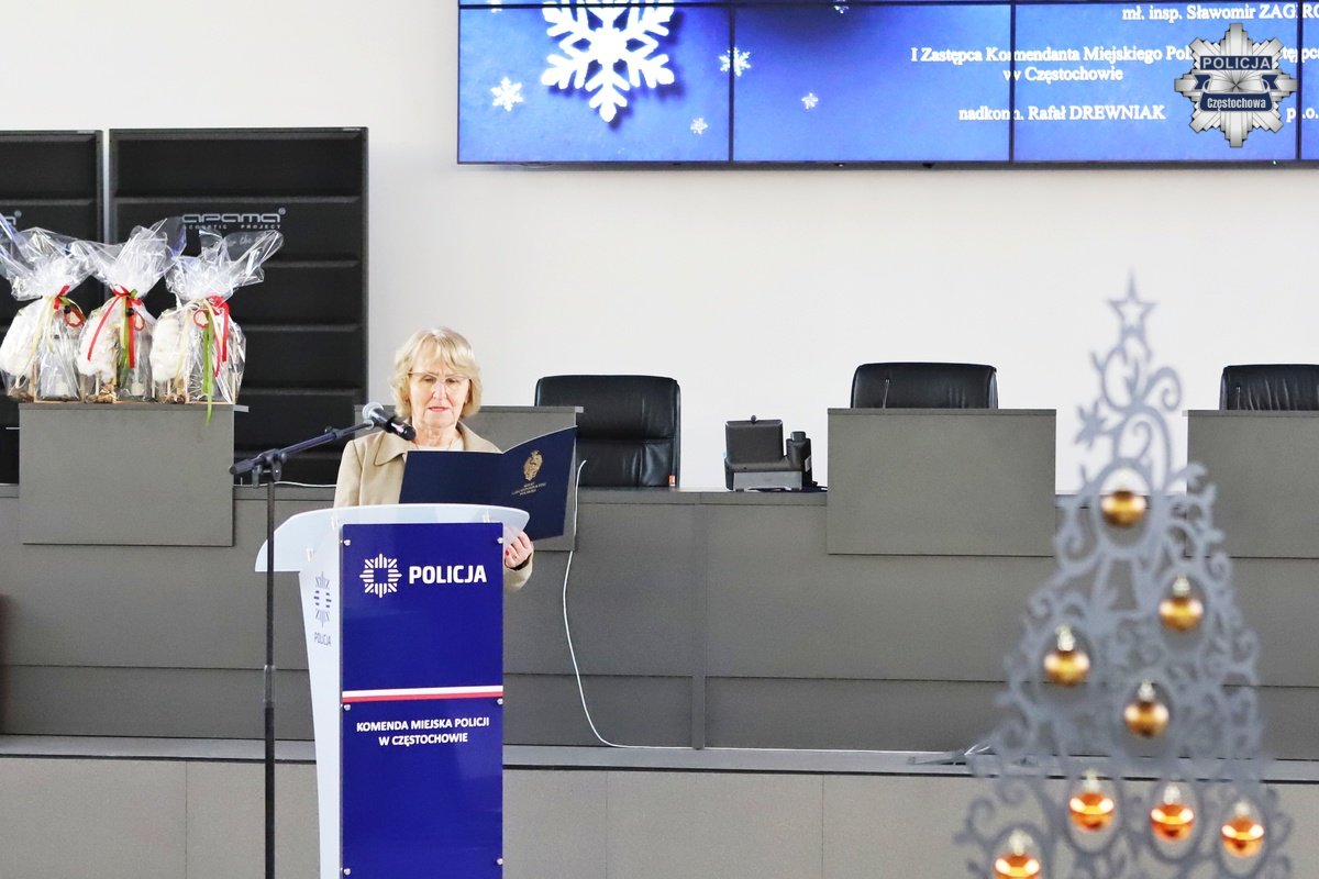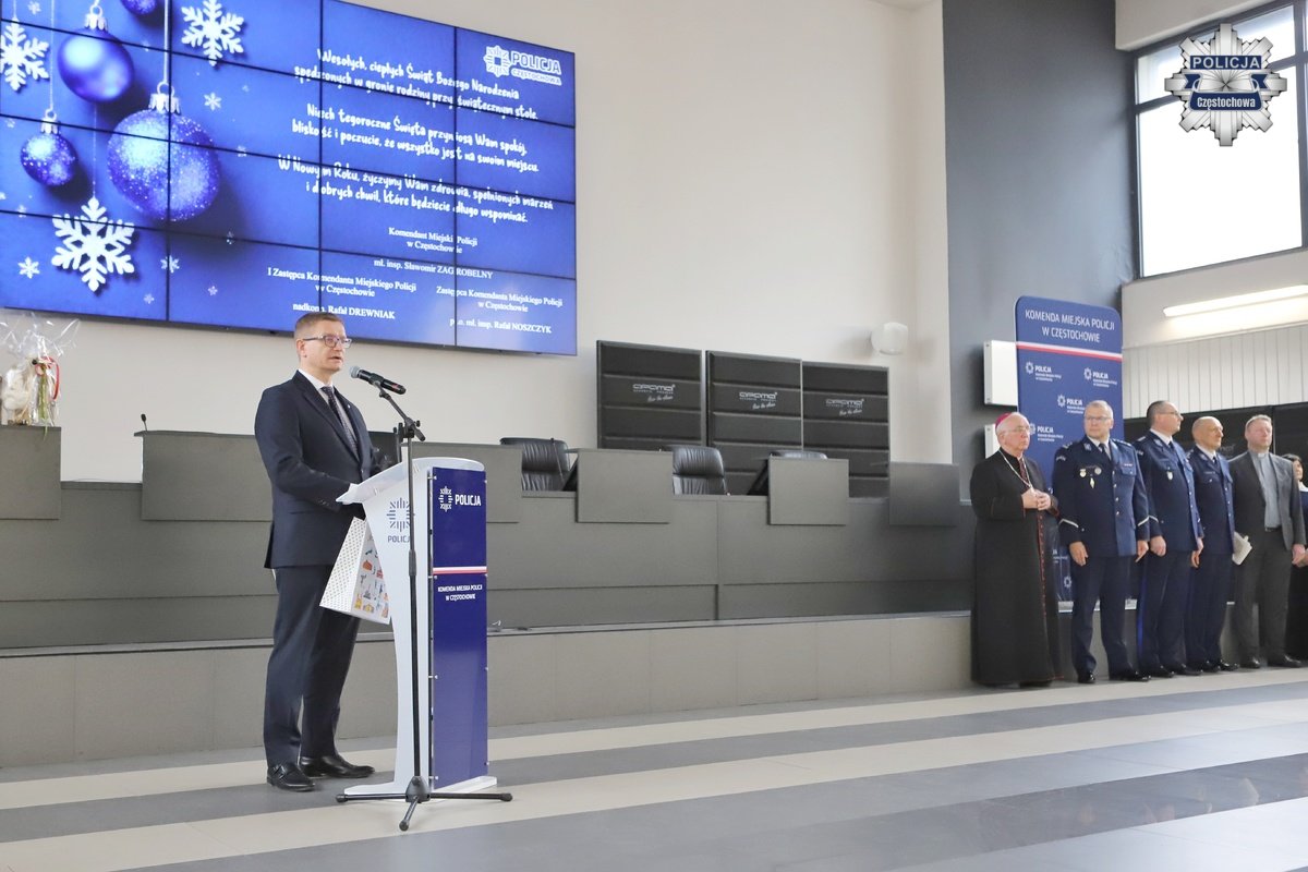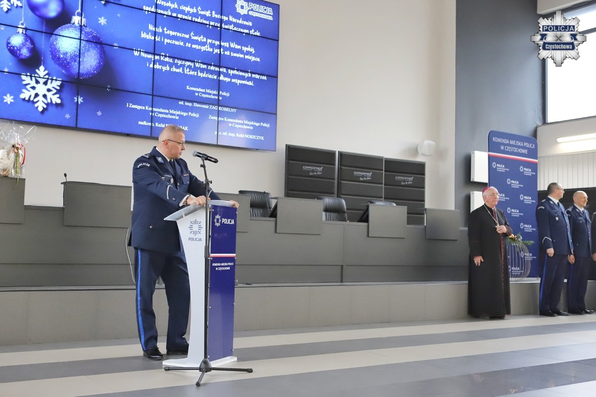 Wczoraj w Komendzie Miejskiej Policji w Częstochowie odbyło się uroczyste spotkanie z okazji Nadchodzących Świąt Bożego Narodzenia. Szef częstochowskiego garnizonu mł. insp. Sławomir Zagrobelny wraz ze swoimi zastępcami złożył policjantom i pracownikom cywilnym życzenia spokojnych i rodzinnych świąt Bożego Narodzenia. Uroczystość uświetnił występ uczniów Zespołu Szkół Muzycznych imienia Józefa Żebrowskiego z Częstochowy oraz orkiestry Śląskiej Policji.