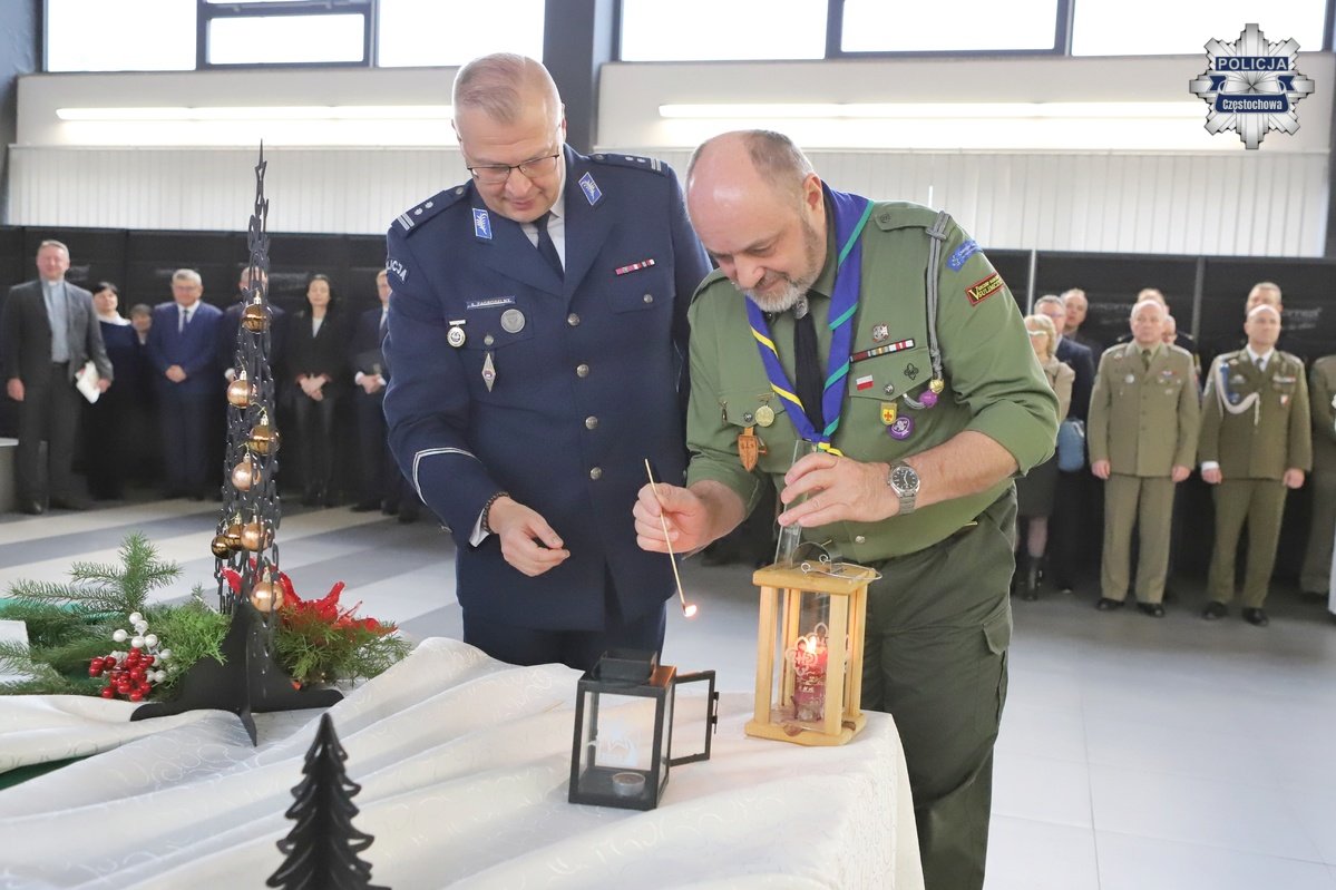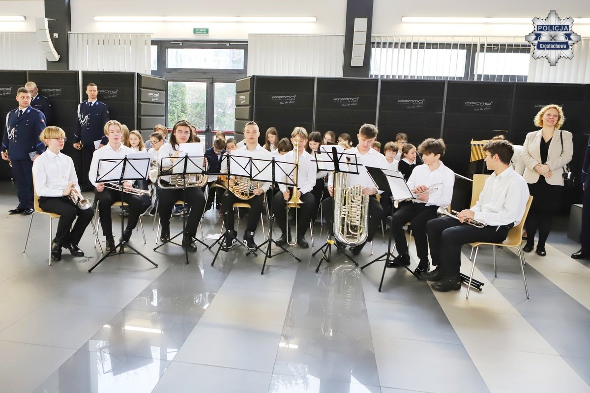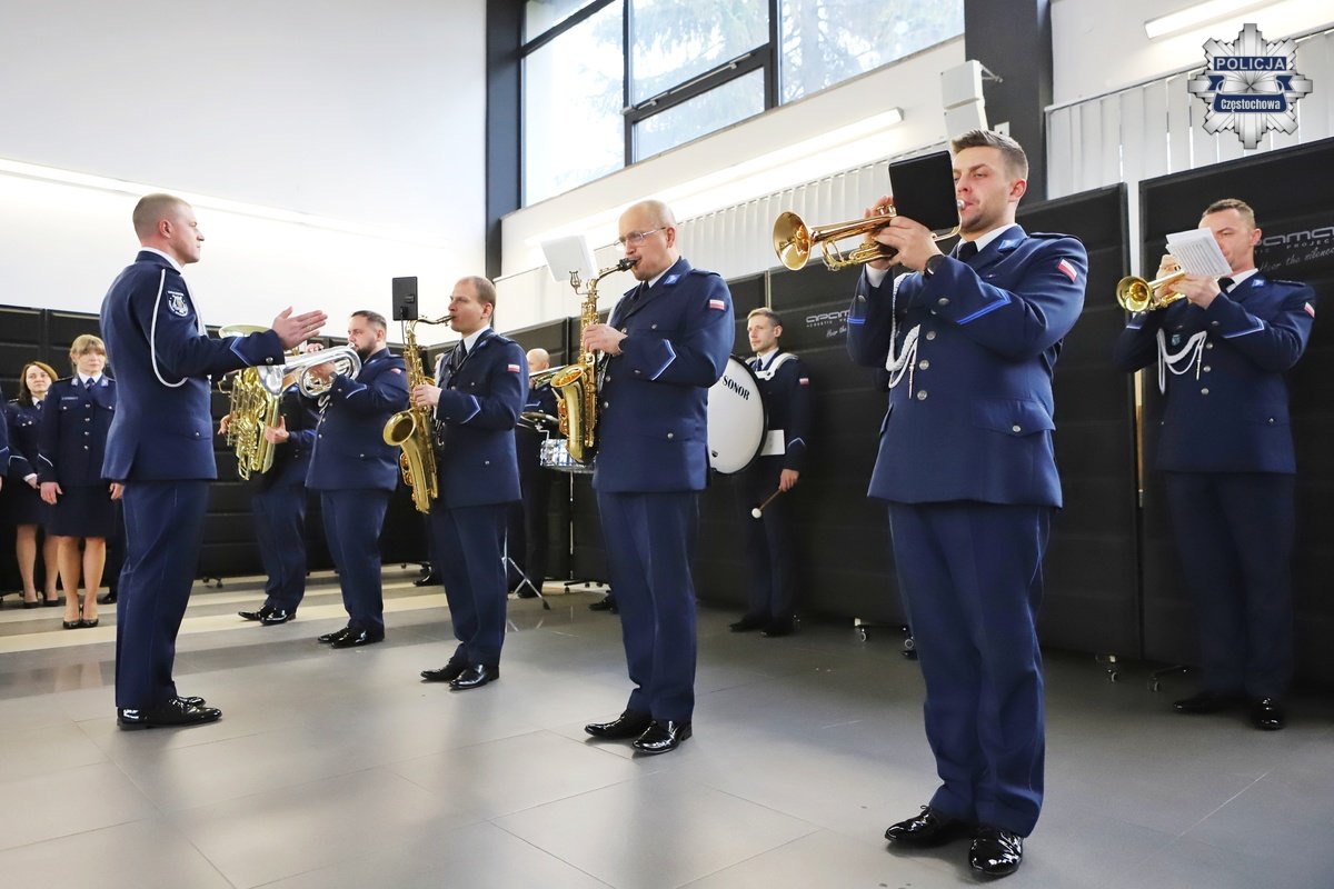 Uroczyste spotkanie z okazji świąt Bożego Narodzenia rozpoczęło się występem artystycznym wykonanym przez orkiestrę Śląskiej Policji uczniów Zespołu Szkół Muzycznych imienia Józefa Żebrowskiego z Częstochowy. Następnie mł. inspektor Sławomir Zagrobelny powitał policjantki, policjantów i pracowników cywilnych oraz zaproszonych gości.