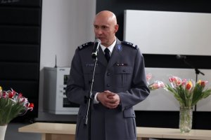 Komendant Miejski Policji w Częstochowie mł. insp. Dariusz Atłasik wraz z zastępcami - podinsp. Mariuszem Strzeleckim i nadkom. Dariuszem Kiedrzynem oraz przedstawicielami kadry kierowniczej złożyli dzisiaj kobietom pracującym w częstochowskiej komendzie serdeczne życzenia z okazji Dnia Kobiet.