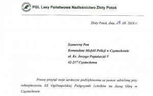 Na ręce Komendanta Miejskiego Policji w Częstochowie mł. insp. Sławomira Litwina wpłynęły podziękowania od Nadleśniczego Nadleśnictwa Złoty Potok Pana Mirosława Unglika za pomoc w zapewnieniu bezpieczeństwa pielgrzymom biorącym udział w XX Ogólnopolskiej Pielgrzymce Leśników na Jasną Górę 17 września 2016 r.