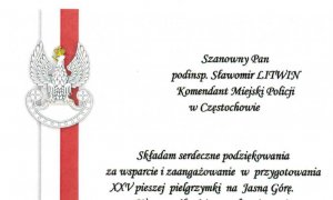Na ręce Komendanta Miejskiego Policji w Częstochowie mł. insp. Sławomira Litwina wpłynęły podziękowania od Szefa Wojewódzkiego Sztabu Wojskowego w Katowicach płk. Krzysztofa Radwana za wsparcie i zaangażowanie w przygotowania XXV wojskowej pieszej pielgrzymki na Jasną Górę.