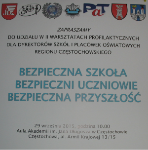 W dniu 29 września o godzinie 10.00 w auli Akademii im. Jana Długosza po raz drugi zostaną zorganizowane warsztaty profilaktyczne dla dyrektorów szkół i placówek oświatowych regionu częstochowskiego pt. „Bezpieczna Szkoła- Bezpieczni uczniowie- Bezpieczna przyszłość”. Wśród organizatorów jest Stowarzyszenie Generałów Policji RP oraz Komenda Miejska Policji w Częstochowie. W ramach spotkania przewidywane jest spektakl pt. „Spisek” przygotowany przez częstochowską grupę PaT.